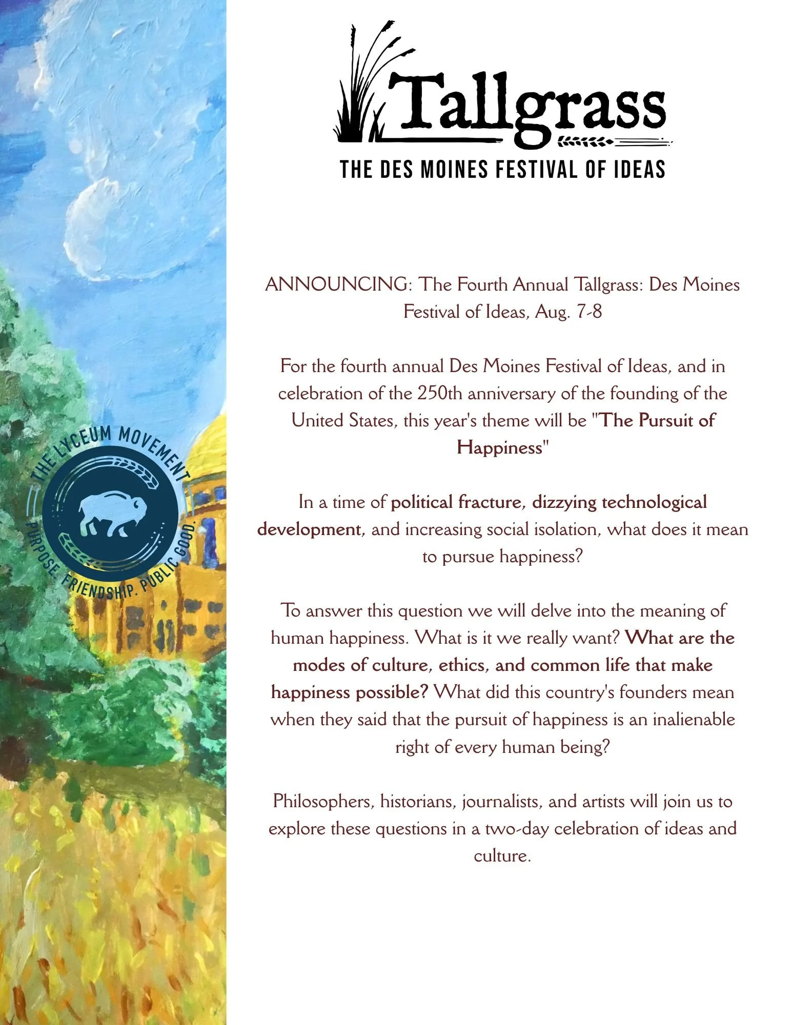 The Tallgrass Festival of Ideas is an opportunity to confront the most interesting subjects of our time in a spirit of generosity, openness, and friendship.